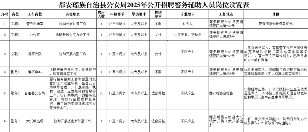 都安瑤族自治縣公安局本次擬招聘警務(wù)輔助人員30人,具體招聘崗位、人數(shù)、資格條件詳見(jiàn)《都安瑤族自治縣公安局2025年公開(kāi)招聘警務(wù)輔助人員崗位設(shè)置表》