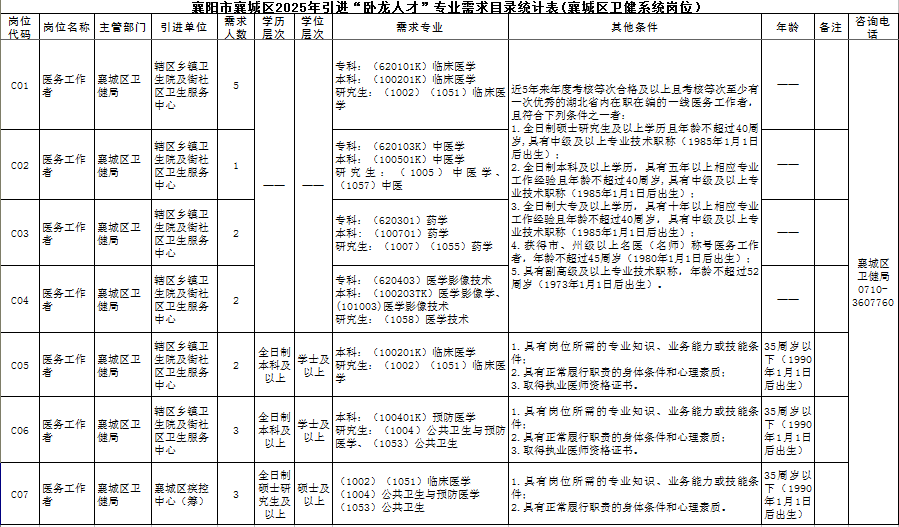 2025-06-06 14:42:00閱讀()襄陽市衛(wèi)生健康委員會襄陽市襄城區(qū)2025年度計(jì)劃引進(jìn)“臥龍人才”91名。其中,C類崗位為優(yōu)秀醫(yī)務(wù)工作者引才,共引進(jìn)18名。其中,C01-C04崗面向湖北省內(nèi)在職在編、專業(yè)技術(shù)精湛的一線醫(yī)務(wù)工作者,引進(jìn)10名;C05-C06崗面向普通高校全日制本科及以上學(xué)歷畢業(yè)生,并取得相應(yīng)學(xué)歷學(xué)位,同時需取得執(zhí)業(yè)醫(yī)師資格證書,引進(jìn)5名;C07崗面向國內(nèi)普通高校或海外知名高校全日制碩士研究生及以上學(xué)歷的應(yīng)屆、往屆畢業(yè)生,引進(jìn)3名。