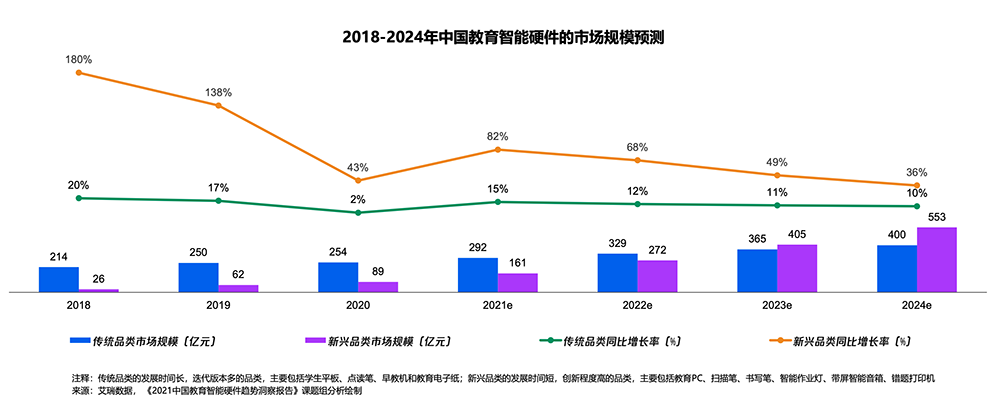 國內(nèi)移動(dòng)互聯(lián)網(wǎng)大數(shù)據(jù)公司QuestMobile數(shù)據(jù)顯示,僅在2021年一季度,教育硬件領(lǐng)域就有56起投融資事件。同時(shí),據(jù)騰訊研究院《2021中國教育智能硬件趨勢洞察報(bào)告》預(yù)測,2024年中國教育智能硬件市場預(yù)計(jì)達(dá)近千億元規(guī)模,其中新興品類市場規(guī)模553億元,同比增長率36%。