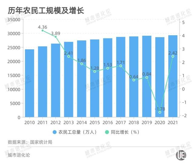 總量還在增長(zhǎng),但是增速已經(jīng)減緩了。2021年,全國(guó)農(nóng)民工總量29251萬(wàn)人,與2019年相比只增加174萬(wàn)人。