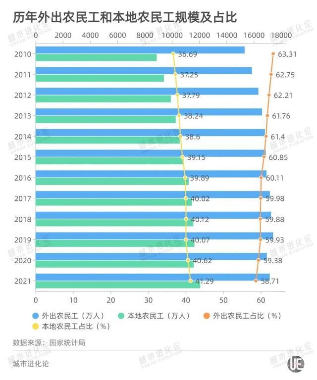 2021年,留在自己鄉(xiāng)鎮(zhèn)的農(nóng)民工又增加了,達(dá)到1.21億人,占四成有余;外出農(nóng)民工雖然是主流,為1.72億人,不過(guò)占比一直在下降,從2010年的63.31%下滑至2021年的58.71%。