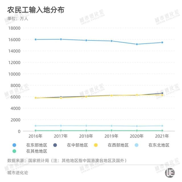 歷年的報(bào)告一直在打破“孔雀東南飛”的印象。僅看2016年到2021年,以京津冀、江浙滬、珠三角為代表的東部地區(qū),雖然吸納了過(guò)半的農(nóng)民工,但其總量已從15960 萬(wàn)人減少到15438萬(wàn)人,占比也從56.65%降至52.78%。