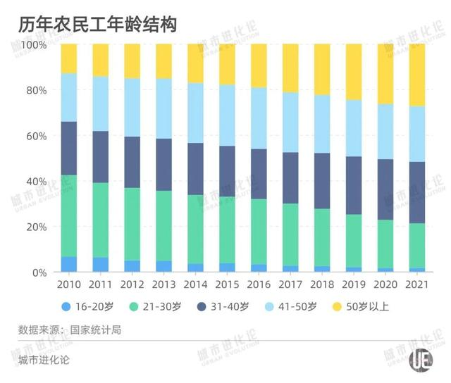與之形成對(duì)比的是,21-30歲農(nóng)民工占比不斷下降。2010年這群年輕農(nóng)民工占比尚有35.9%,近年來(lái)一路縮減,2021年其占比首次跌破20%,只剩19.6%。