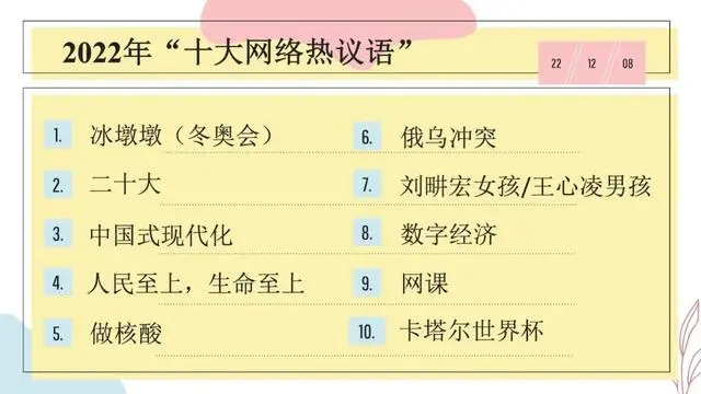 入選2022年“十大網(wǎng)絡(luò)熱議語(yǔ)”的有:“冰墩墩(冬奧會(huì))”“二十大”“中國(guó)式現(xiàn)代化”“人民至上,生命至上”“做核酸”“俄烏沖突”“劉畊宏女孩/王心凌男孩”“數(shù)字經(jīng)濟(jì)”“網(wǎng)課”“卡塔爾世界杯”。